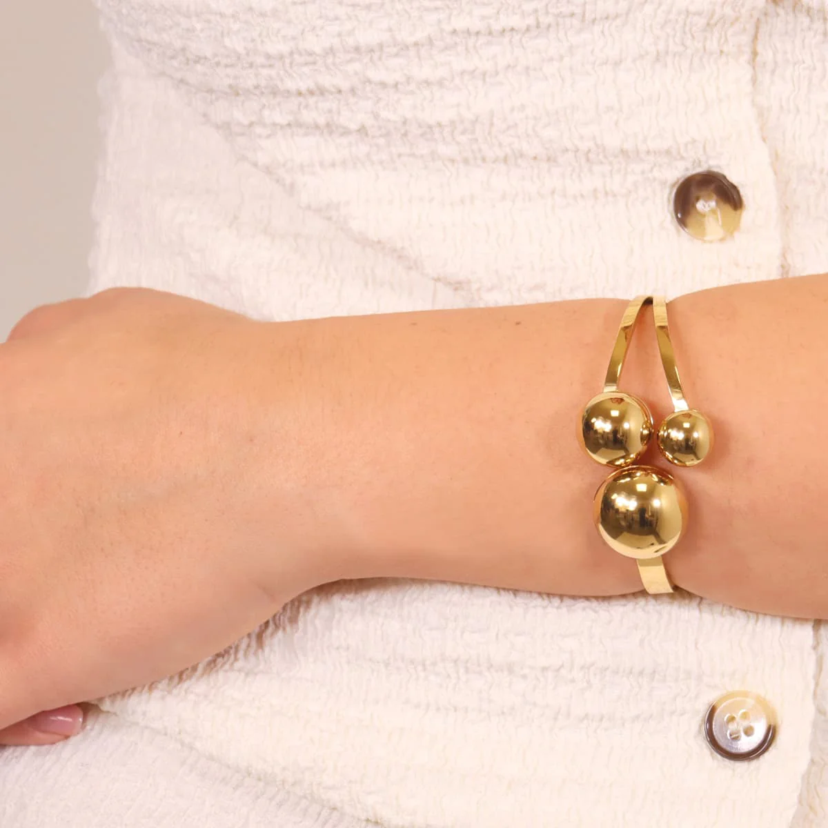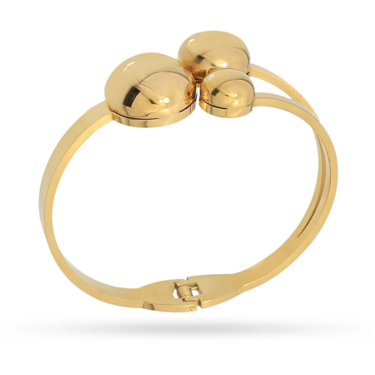 Crafted from gold surgical steel and detailed with semi-spheres, this rigid bracelet opens easily thanks to its spring-loaded system