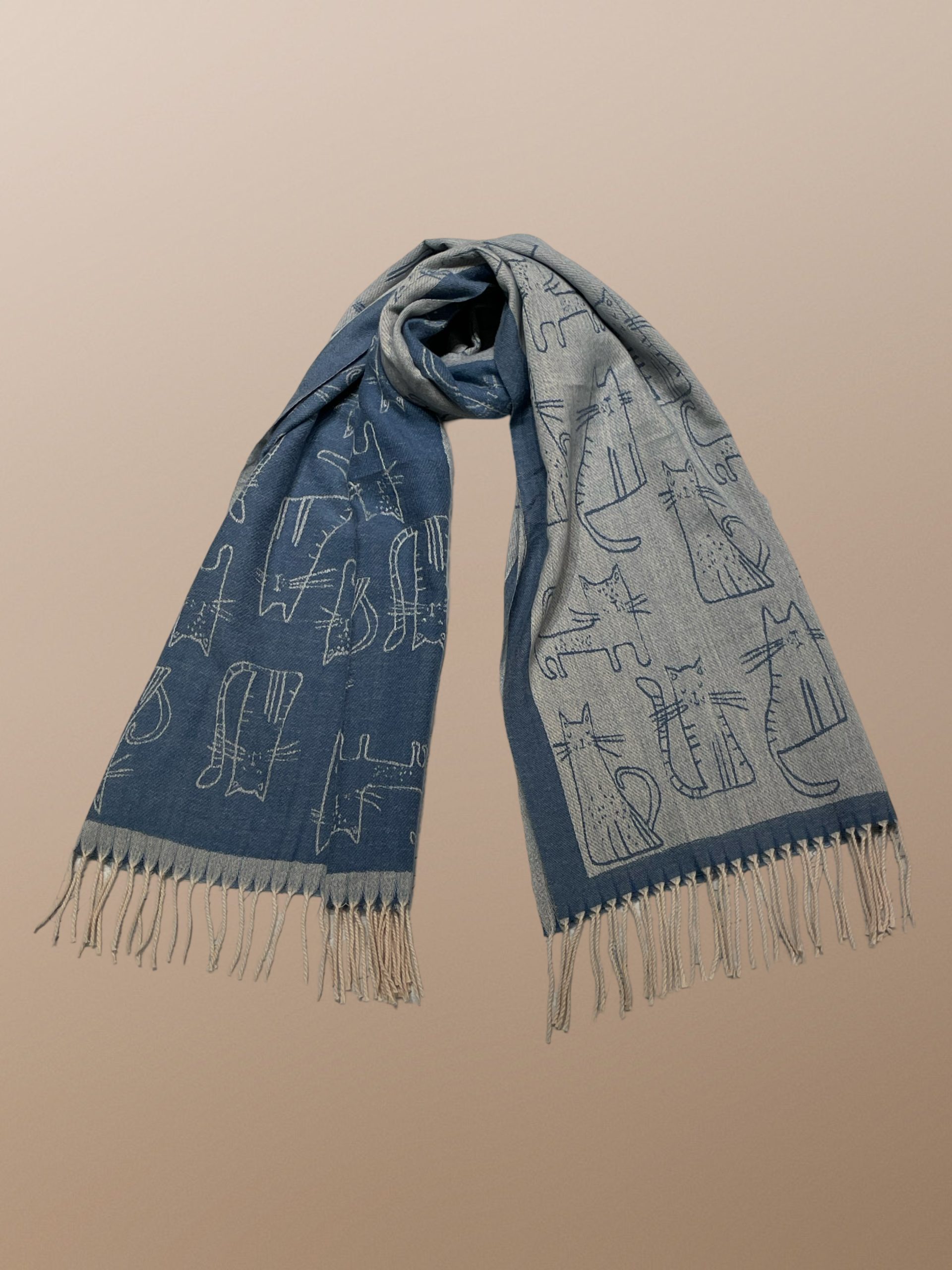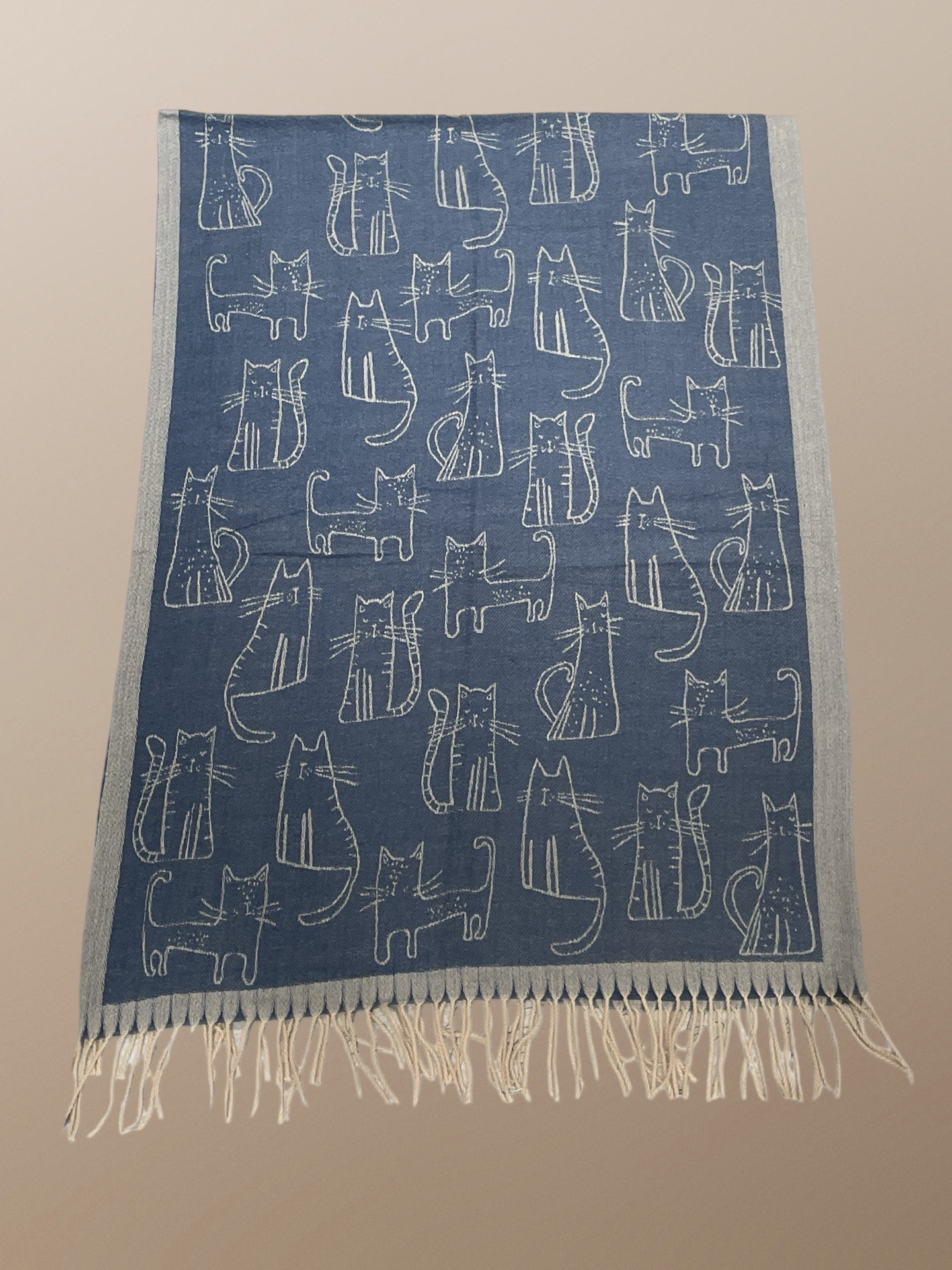 Φουλάρι με παιχνιδιάρικες εικονογραφήσεις γατών σε αναστρέψιμο σχέδιο, προσθέτοντας μια νότα γοητείας και δημιουργικότητας στο ντύσιμό σας. Κατασκευασμένο από μαλακό, υψηλής ποιότητας ύφασμα, έχει διαστάσεις 1,90 μέτρα μήκος και 65 εκ. πλάτος, προσφέροντας ένα ζεστό και στιλάτο αξεσουάρ. Διατίθεται σε διάφορα χρώματα, όπως μπλε, ροζ, μωβ, μαύρο και καφέ, για να ταιριάζει σε κάθε γούστο και ντύσιμο.