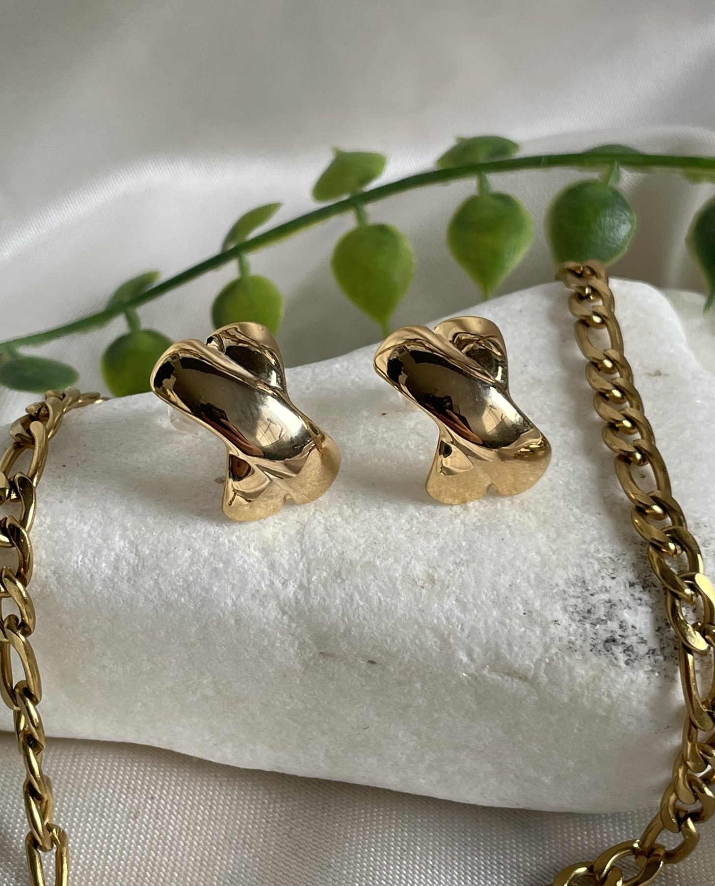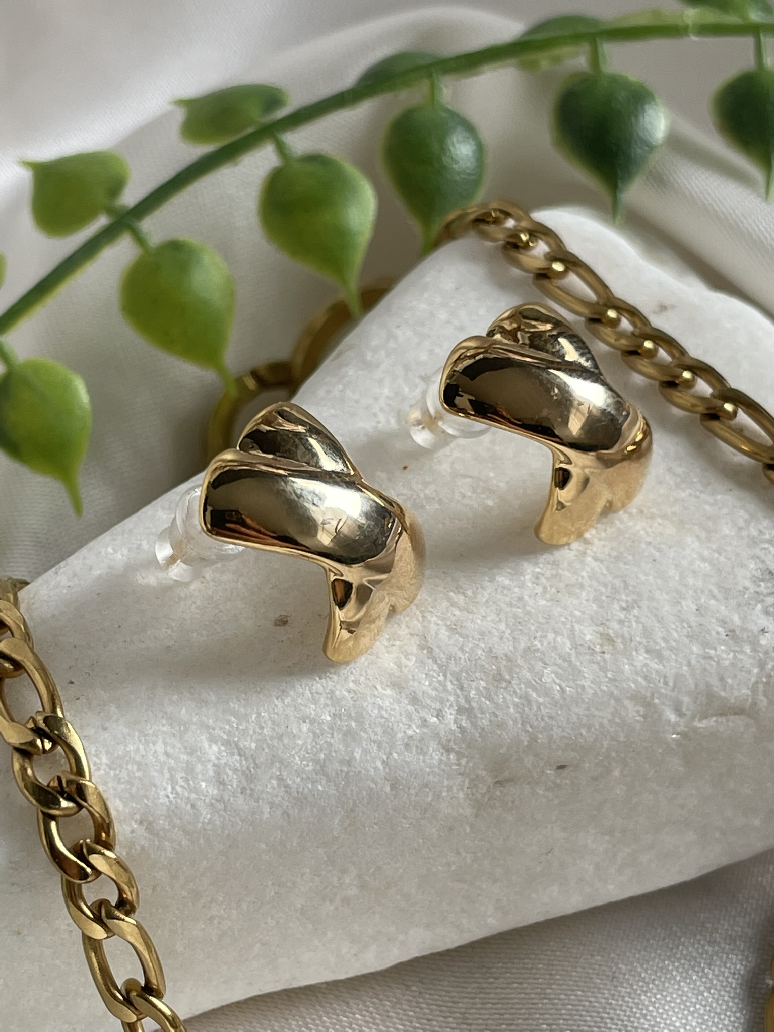 These elegant earrings feature a unique, twisted design with a sleek, Gold-tone finish. Crafted from durable stainless steel, they offer a modern and sophisticated look.