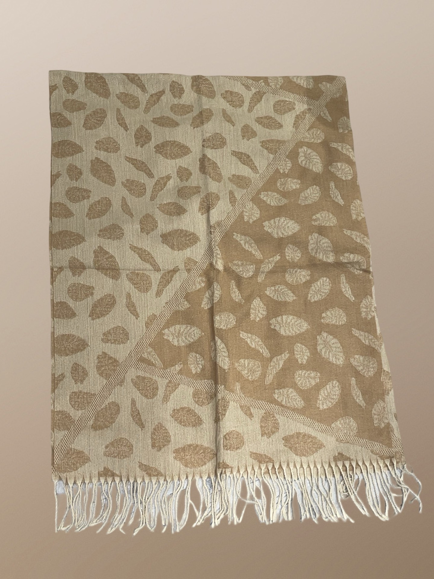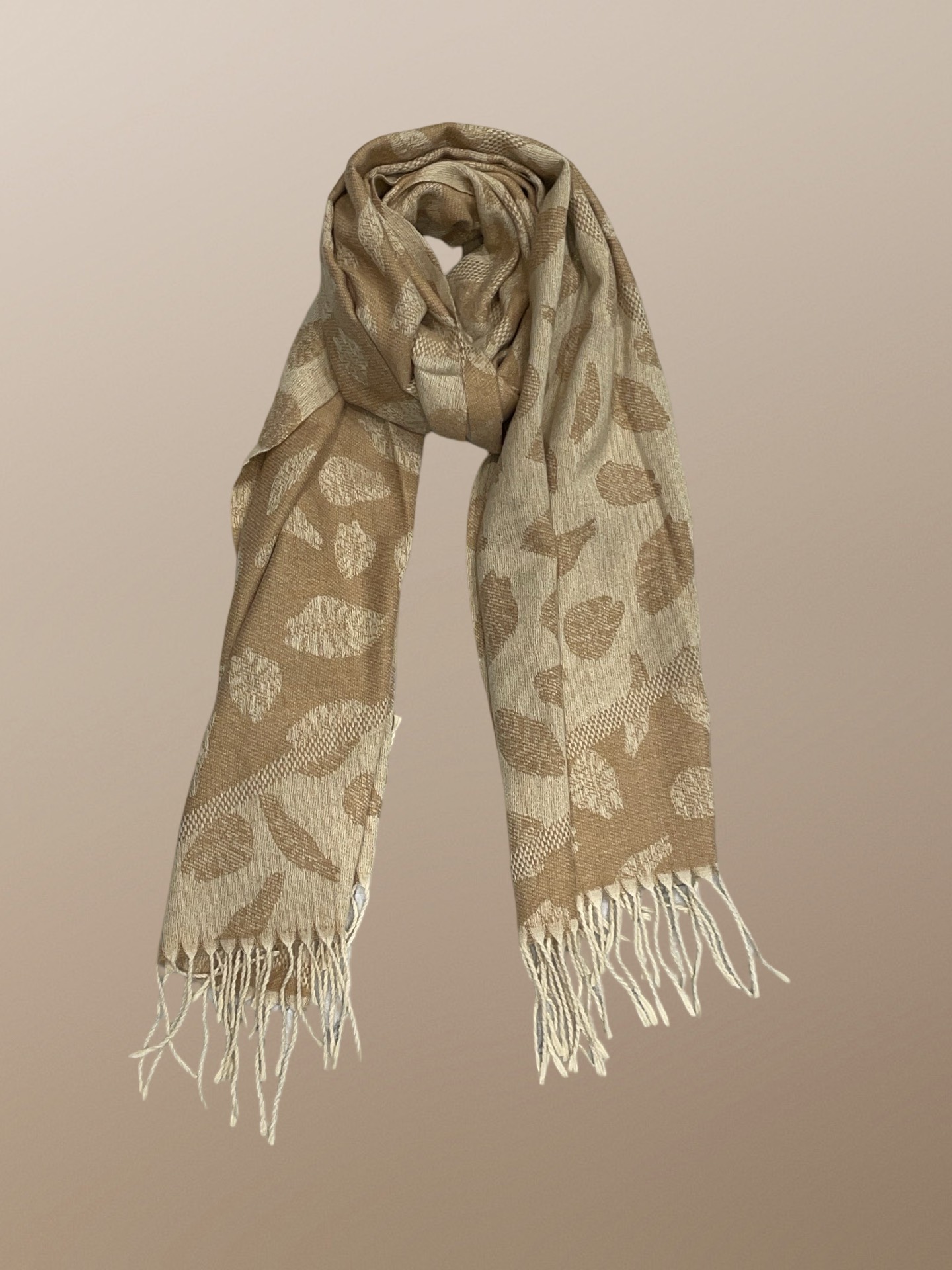 This scarf, measuring 1.90 meters in height and 65 centimeters in width, features a charming leaf pattern and is available in pink, red, black, blue, gray, green, and mustard. Its soft tones make it a versatile accessory for any outfit. Pair it with a neutral-toned coat or jacket for a sophisticated look, or add a pop of color to a monochromatic outfit. For a casual style, wrap it loosely over a sweater or denim jacket. It also complements flowy dresses or skirts, making it ideal for everyday wear or special occasions.