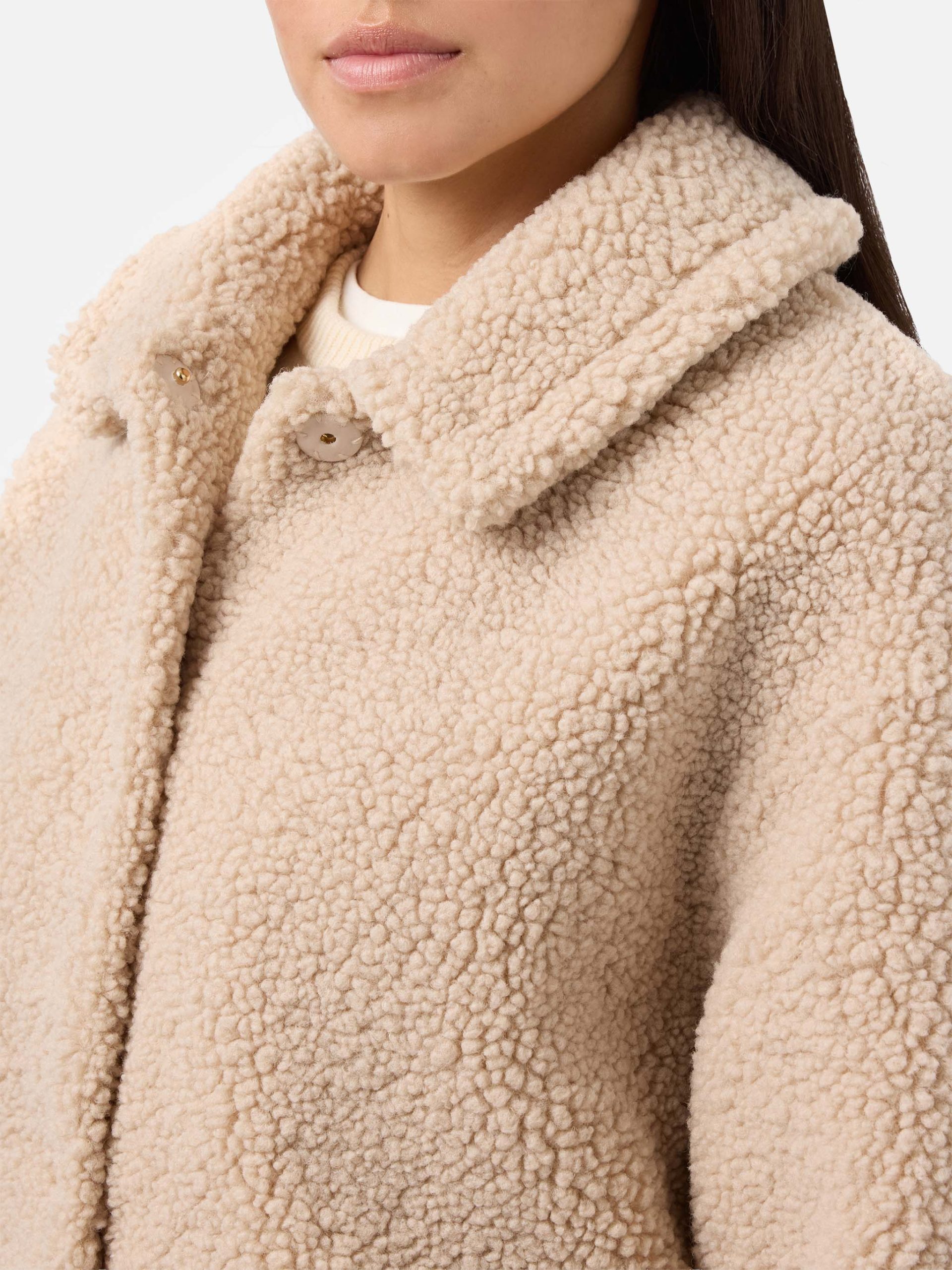 Jeanne is the cozy-cool teddy bomber: oversized volume, a rounded shirt collar, and a back patch for a statement touch.